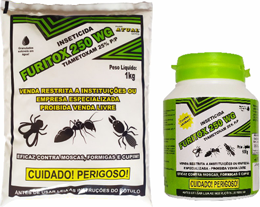 Indicação: Furitox, é um inseticida granulado formulado com o principio ativo Tiametoxam soluvel em água, eficaz no controle de formigas doceiras (monimorium floricula), moscas domésticas (musca doméstica) e cupins para a aplicação por profissionais da área